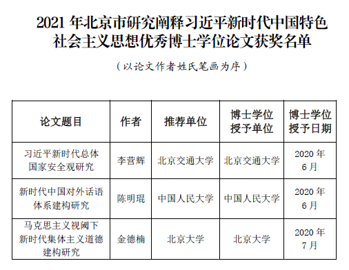 近日,北京市习近平新时代中国特色社会主义思想研究中心(以下简称“北京市研究中心”)公布2021年北京市研究阐释习近平新时代中国特色社会主义思想优秀博士学位论文获奖名单。p站 韩振峰教授指导的20届博士毕业生、p站 青年教师李营辉的博士论文《习近平新时代总体国家安全观研究》入围获奖。